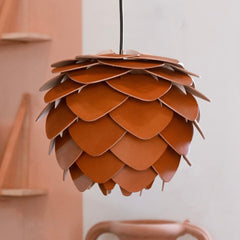 Her har du en lampe, som du ikke typisk kan finde i de klassiske lampe forretninger. Denne lampe er nemlig special designet og kommer af inspiration fra tidligere kunder. Flere har spurgt om mine læderkogler var lamper, så derefter kom inspirationen til pinje koglen.