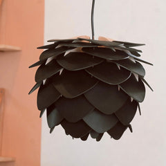 Her har du en lampe, som du ikke typisk kan finde i de klassiske lampe forretninger. Denne lampe er nemlig special designet og kommer af inspiration fra tidligere kunder. Flere har spurgt om mine læderkogler var lamper, så derefter kom inspirationen til pinje koglen.